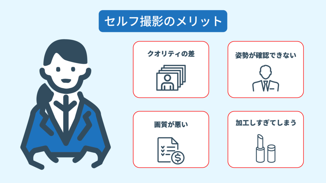 また、自分自身で確認するだけでは姿勢や服装の乱れに気づきにくく、第三者目線の仕上がりが期待できません。特に、アプリなどで肌補正やデカ目効果を使用すると、自然さが失われ、若作りや不自然な印象を与えてしまいます。このように、自撮り写真だと採用担当者にバレやすく、悪目立ちしてしまう可能性が高いです。
