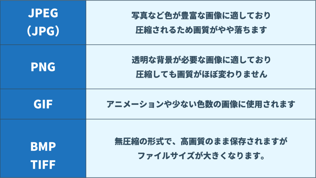 代表的な画像のファイル形式には、以下のようになっており、それぞれの形式は用途や目的に応じて使い分けられます。